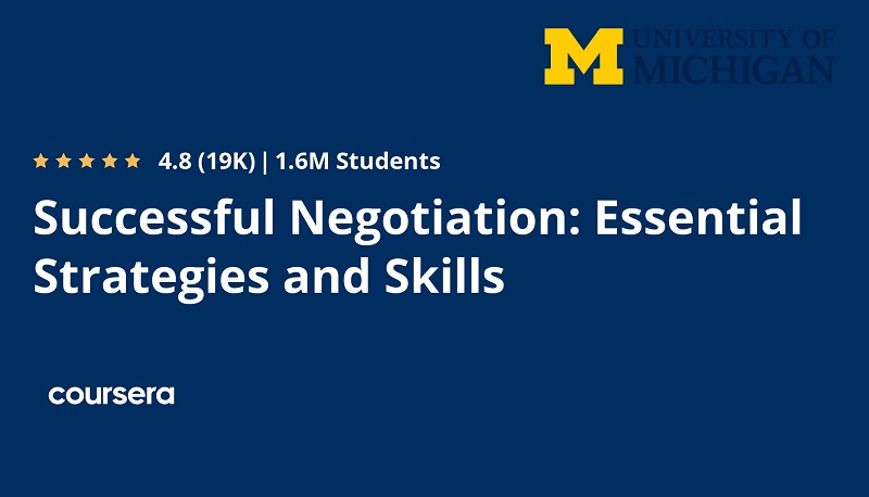 [vc_row][vc_column][vc_column_text css=””]دوره آموزشی “Successful Negotiation: Essential Strategies and Skills” از دانشگاه میشیگان در Coursera به آموزش مهارت‌های کلیدی در مذاکره می‌پردازد و استراتژی‌ها و تکنیک‌های مورد نیاز برای تبدیل شدن به یک مذاکره‌کننده موفق را آموزش می‌دهد. این دوره شامل موضوعات زیر است: